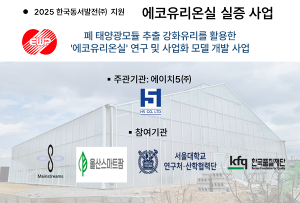[환경일보] 박준영 기자 = 에이치5㈜(대표 황헌)가 울산광역시 울주군 언양읍에 세계 최초로 태양광 폐패널을 활용한 에너지절감형 고성능 ‘에코유리온실’을 성공적으로 준공했다고 밝혔다. 이 온실은 한국동서발전㈜가 2025년 1월부터 2026년 12월까지 2년에 걸쳐 지원하는 ‘폐 태양광모듈 추출 강화유리 활용 에코유리온실 연구 및 사업화 모델 개발사업’의 성과물이다.